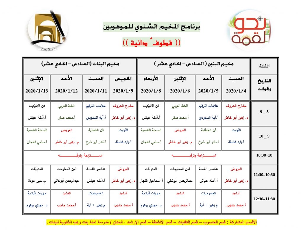 الرئيسية/أخبار التعليم/إعلانات وتعليمات/المخيم الشتوي للموهوبين إعلانات وتعليماتمبادرة نحو القمةمخيمات شتوية وصيفية المخيم الشتوي للموهوبين Eng.Zuheir 2 يناير، 20200 380 أقل من دقيقة